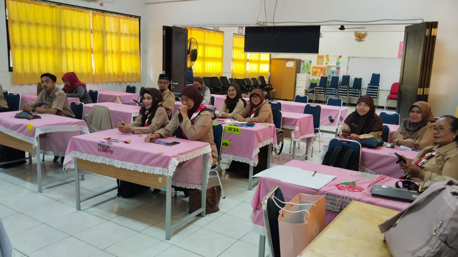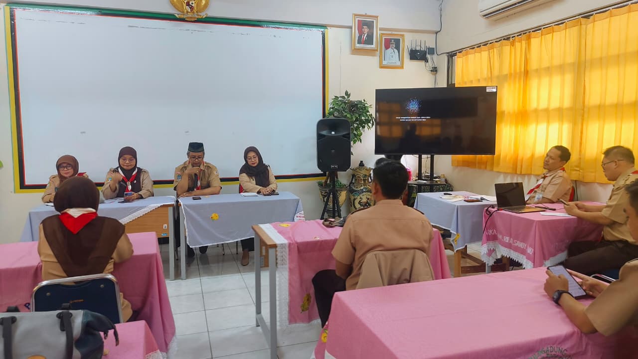 Suasana rapat terlihat tertib dan penuh kekompakan. Dalam foto bersama, seluruh pengurus tampak berdiri rapi mengenakan seragam cokelat dengan atribut organisasi, mencerminkan kebersamaan dan kesiapan menjalankan amanah. Sementara dalam dokumentasi jalannya rapat, para pengurus duduk berhadapan di meja-meja yang tertata rapi dengan taplak merah muda, menyimak pemaparan materi melalui layar proyektor dan televisi. Diskusi berlangsung aktif namun tetap kondusif, menunjukkan komitmen bersama dalam memajukan organisasi.